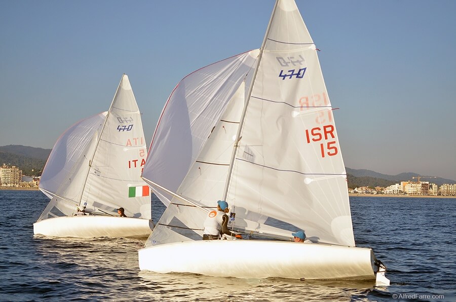 La clase 470 Mixto, con la prueba disputada hoy y las tres del domingo, es la que va más avanzada en la competición con cuatro mangas disputadas, con lo que la flota ya descarta su peor resultado. Las tripulaciones italianas dominan el podio con dos equipos empatados a cinco puntos, el de la doble subcampeona mundial juvenil Benedetta Di Salle con Francesco Padovani y la del triple campeón del mundo de Optimist Marco Gradoni que navega con Alessandra Dubini y que ha ganado la prueba de hoy, con lo que escalan de la cuarta a la segunda posición. Los actuales campeones de España, María Bover (RCN Palma) y Pablo García (RCN Gran Canaria) han escalado de la séptima a la quinta posición después de poder descartar el fuera de línea con bandera negra (UFD) de la tercera manga, hoy la tripulación balear-canaria ha realizado un décimo tercer puesto en la única prueba celebrada. La cuarta plaza entre españoles e italianos la ocupan los actuales campeones de Europa, los israelíes Nitai Hasson y Saar Tamir, que están a dos puntos del podio.